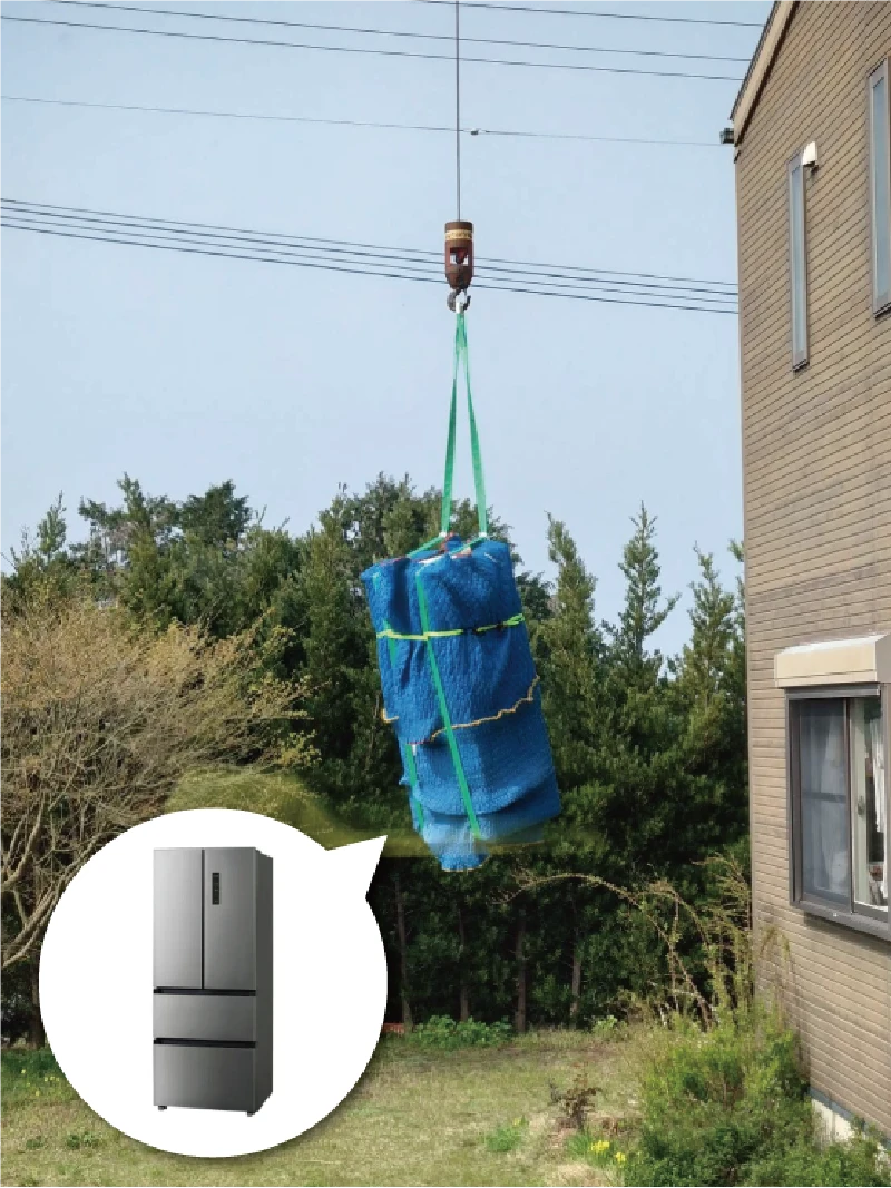 庭に置いてあるプレハブを移動したい、二階のベランダから大型冷蔵庫を搬入したい等、吊りたい物がある際はお気軽にお問い合わせ下さい。